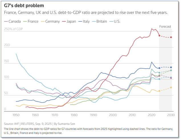 Since the Second World War, Japan experienced the equivalent of an economic miracle by rapidly establishing itself in a variety of primarily export-oriented businesses (autos, consumer electronics, shipbuilding, etc.). However, of late, increased deficit spending, rise in interest rates, troublesome demographics/ increased dependency ratio, and increased defense spending requirements are turning that miracle into something very different. As shown in the above chart, Japan leads the G7 in debt-to-GDP, which is not a problem, until it is. In particular, the need for outside capital and the rise in interest rates might be the catalysts for broader concerns.