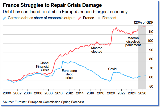 As usual, it is about the money; France is under pressure to cut its deficit, which is currently running at 5.8% of GDP, while it is also pressured to increase defense spending, currently near 2.0%. Since voters are not willing to make the sacrifices, the response is political turmoil.